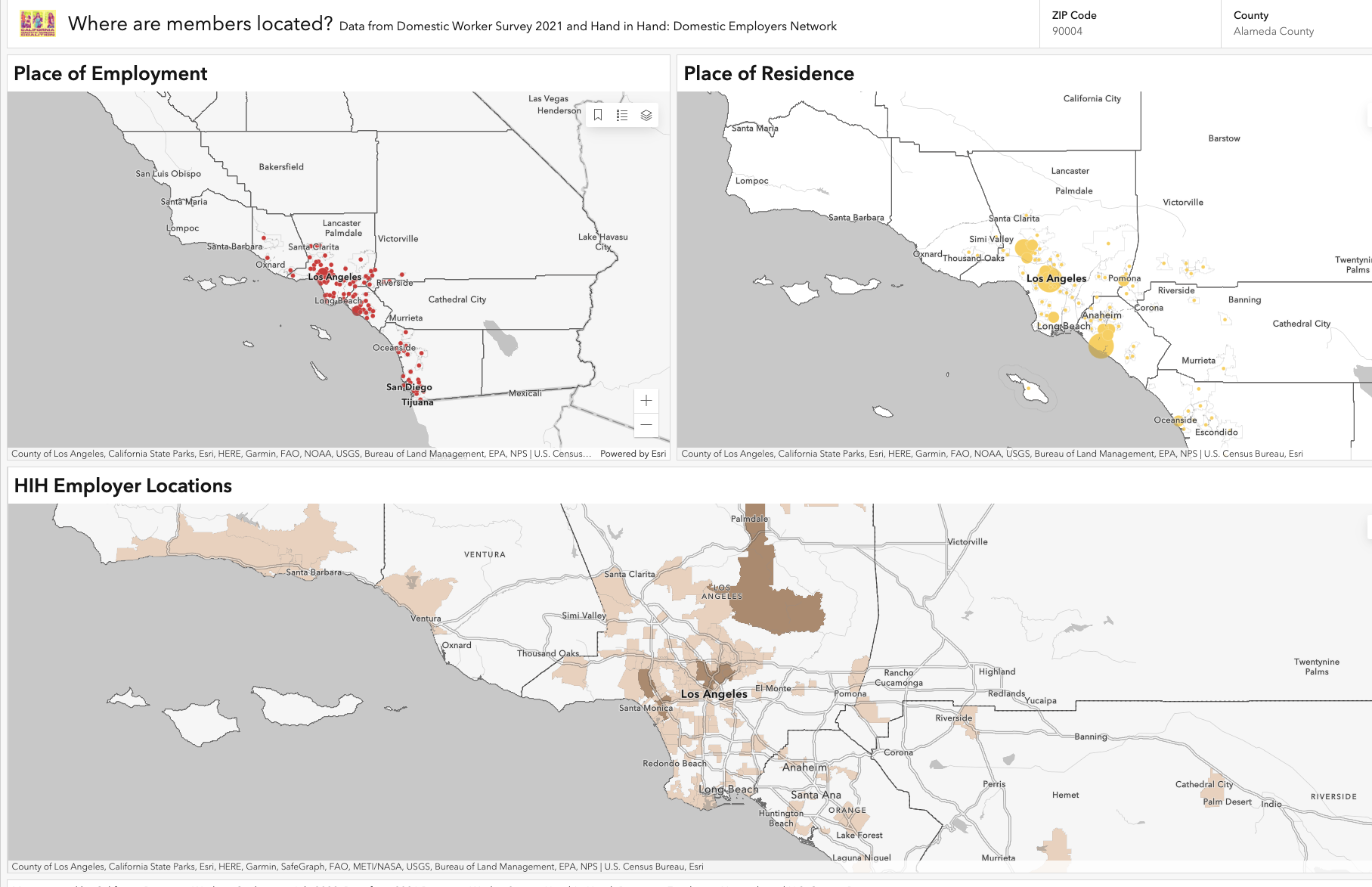 PHS and partner JuHyun Sakota Consulting re-coded and interpreted narrative from multilingual domestic worker survey datasets and cleaned administrative datasets related to labor violations throughout the state. The team also helped CDWC formulate research questions. JuHyun Sakota Consulting also designed online/offline map layouts and guided GIS interns to produce interactive data dashboards using ArcGIS.